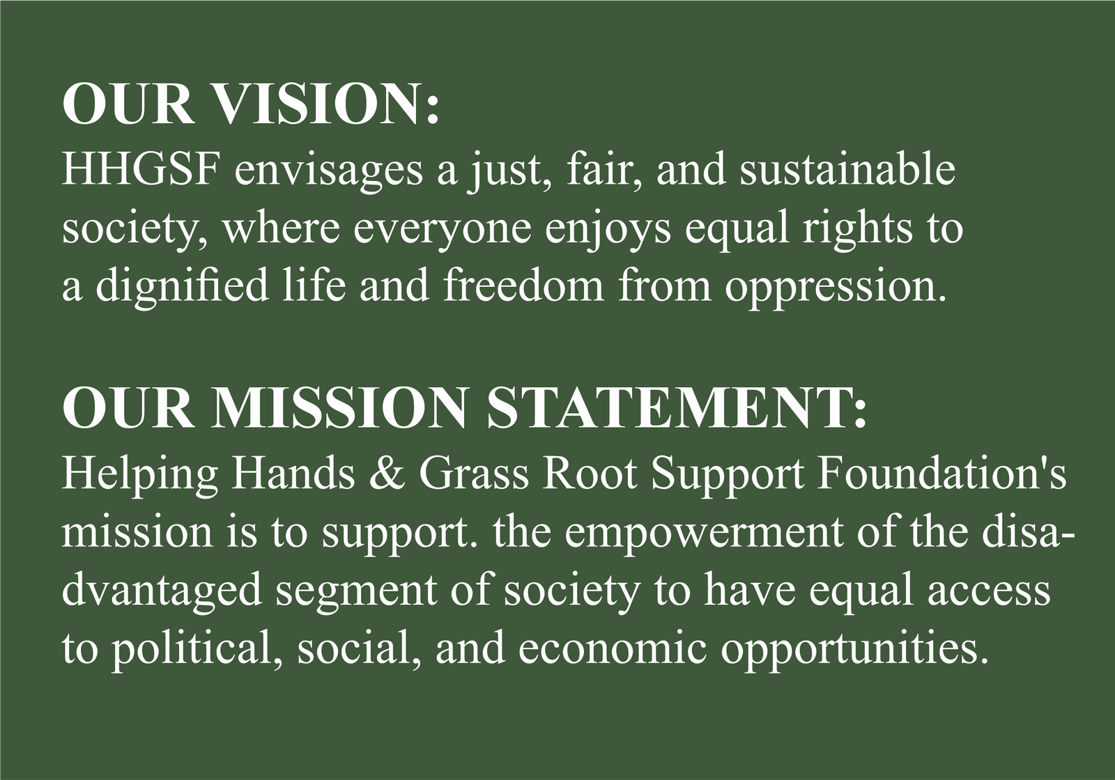 Helping Hands and Grassroot Support Foundation (HHGSF) is Non- Governmental, Non-Religious, and Non-Partisan organizations. Helping Hands work to enhance the quality of life of the disadvantaged segment of the society to have equal access to political, social, and economic opportunities. The organization is registered with the Corporate Affairs Commission, Nigeria. HHGSF has offices in Sokoto and Kebbi States